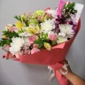 Сочетая кустовые розы, изящные лилии, яркие альстромерии и пышные хризантемы, этот букет является шедевром флористического искусства. Каждый цветок тщательно подобран для создания утонченного, но яркого букета. Представленный в спокойной, нежной упаковке, он идеально подходит для важных моментов, подчеркивая красоту и оригинальность событий.